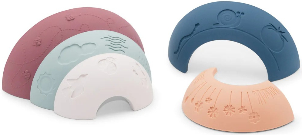 Skládejte je na sebe, zkoumejte, jaké tvary lze vytvořit, ať už stojí, nebo leží na boku. Vkládejte je do sebe, vyvažujte jeden na druhém. Každý oblouk má jedinečný vzor inspirovaný zahradou. Otiskněte je do plastelíny, objevte tvary a vytvořte si vlastní zahradní scénu a příběh. Přidejte je do koupele, smyslové hry nebo si s nimi hrajte venku v hlíně a písku.