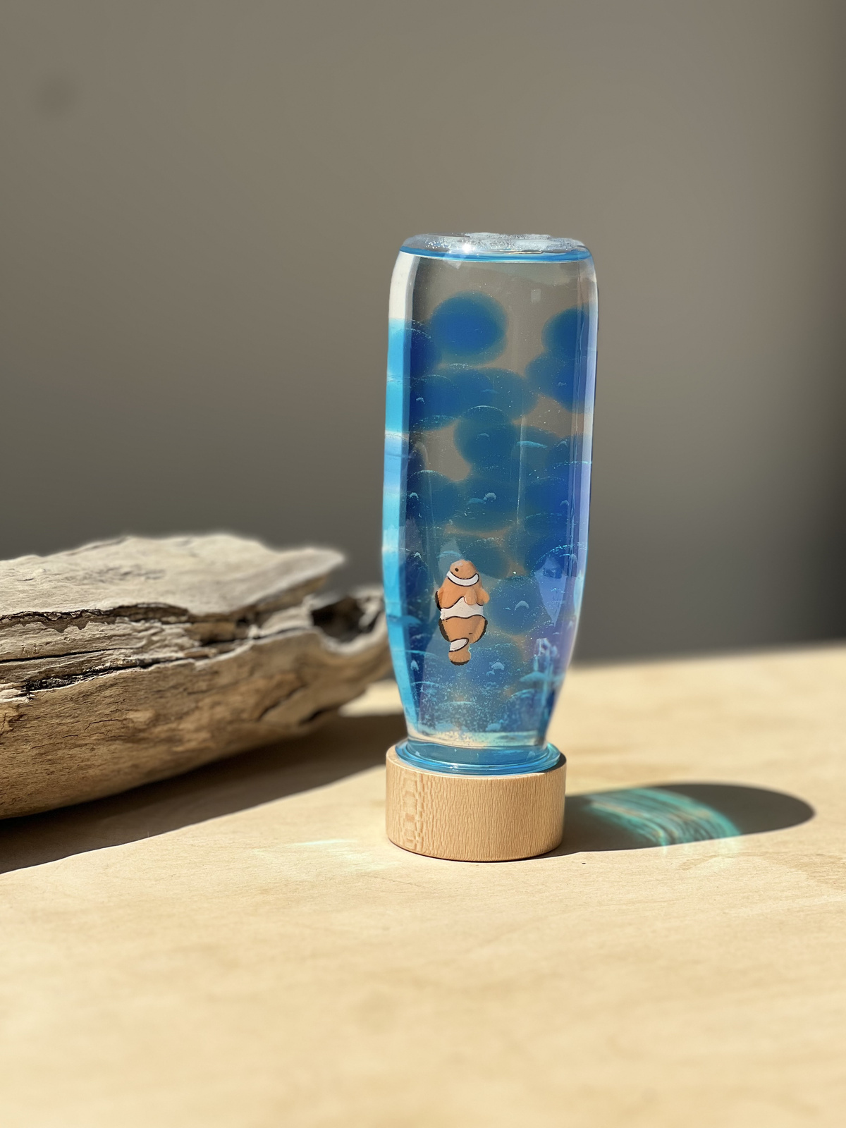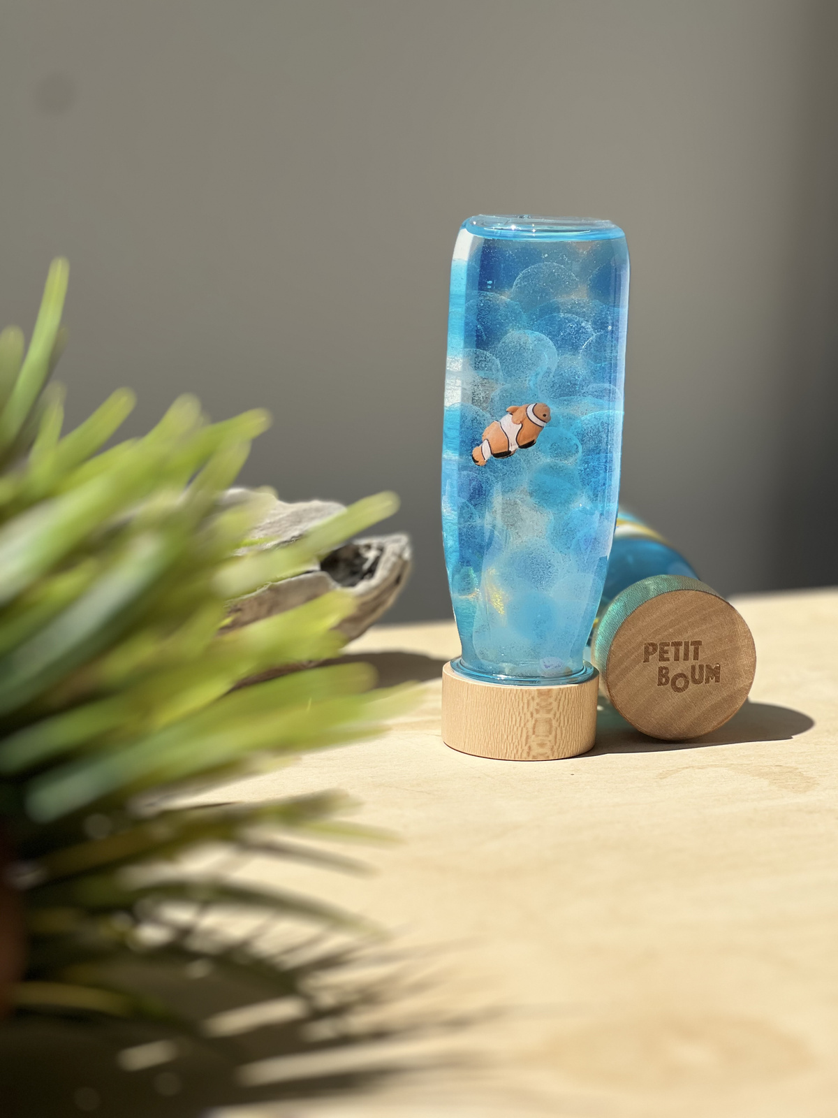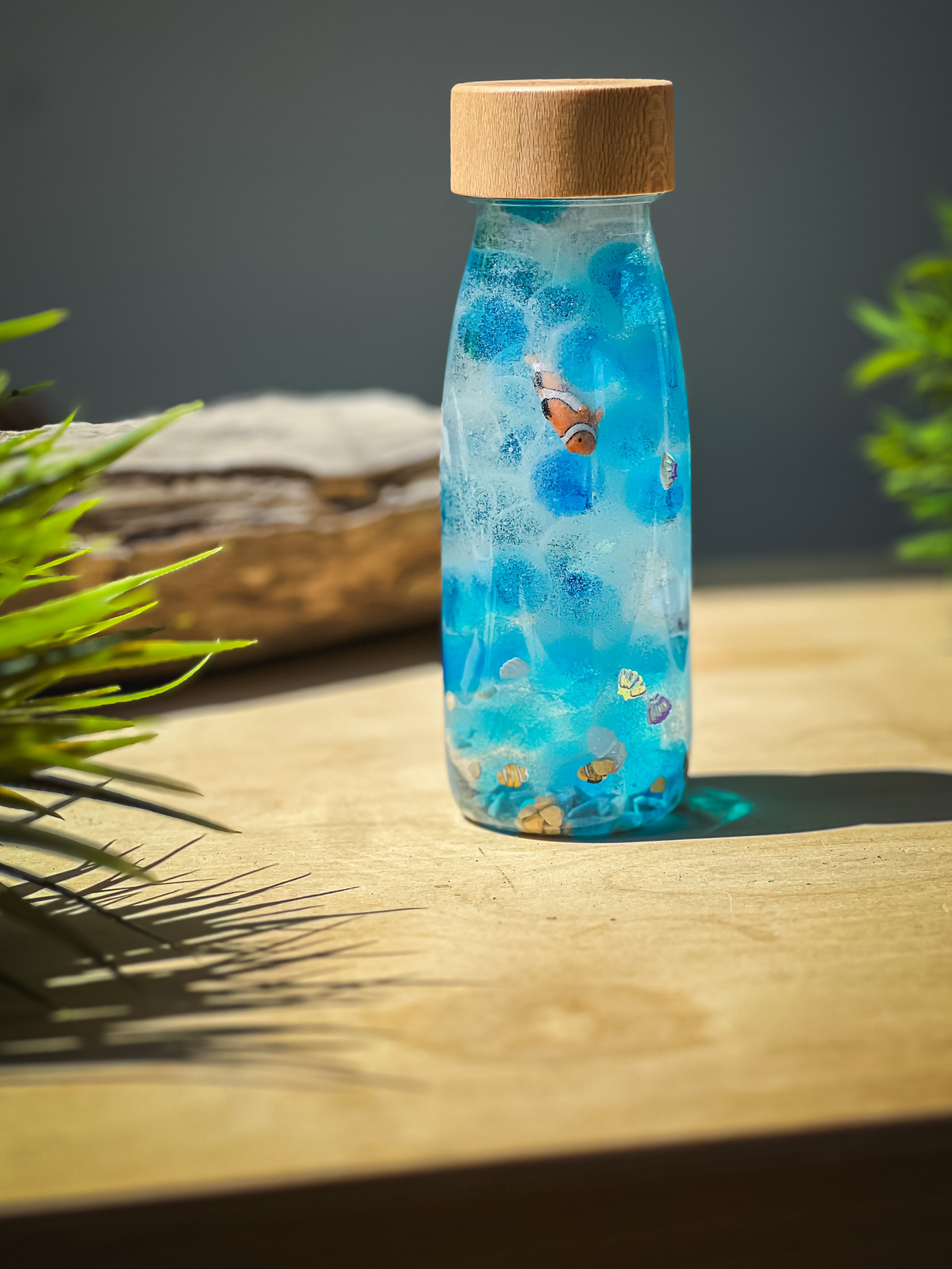 The colors of Petit Boum bottles are inspired by nature and our planet, thematically related to the figurines of animals and plants inside. These bottles help children calm down, supporting them in coping with tension and anxiety that may arise from overstimulation or during the daily discovery of their new world.